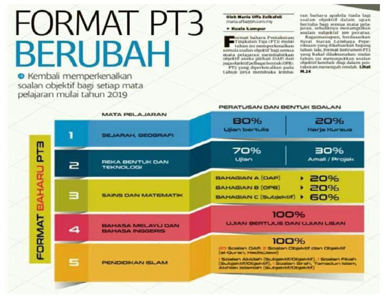 Berikut dikongsikan adalah format soalan/ instrumen serta pemarkahan bagi setiap matapelajaran kssm untuk pentaksiran tingkatan 3 (pt3) mulai 2019: